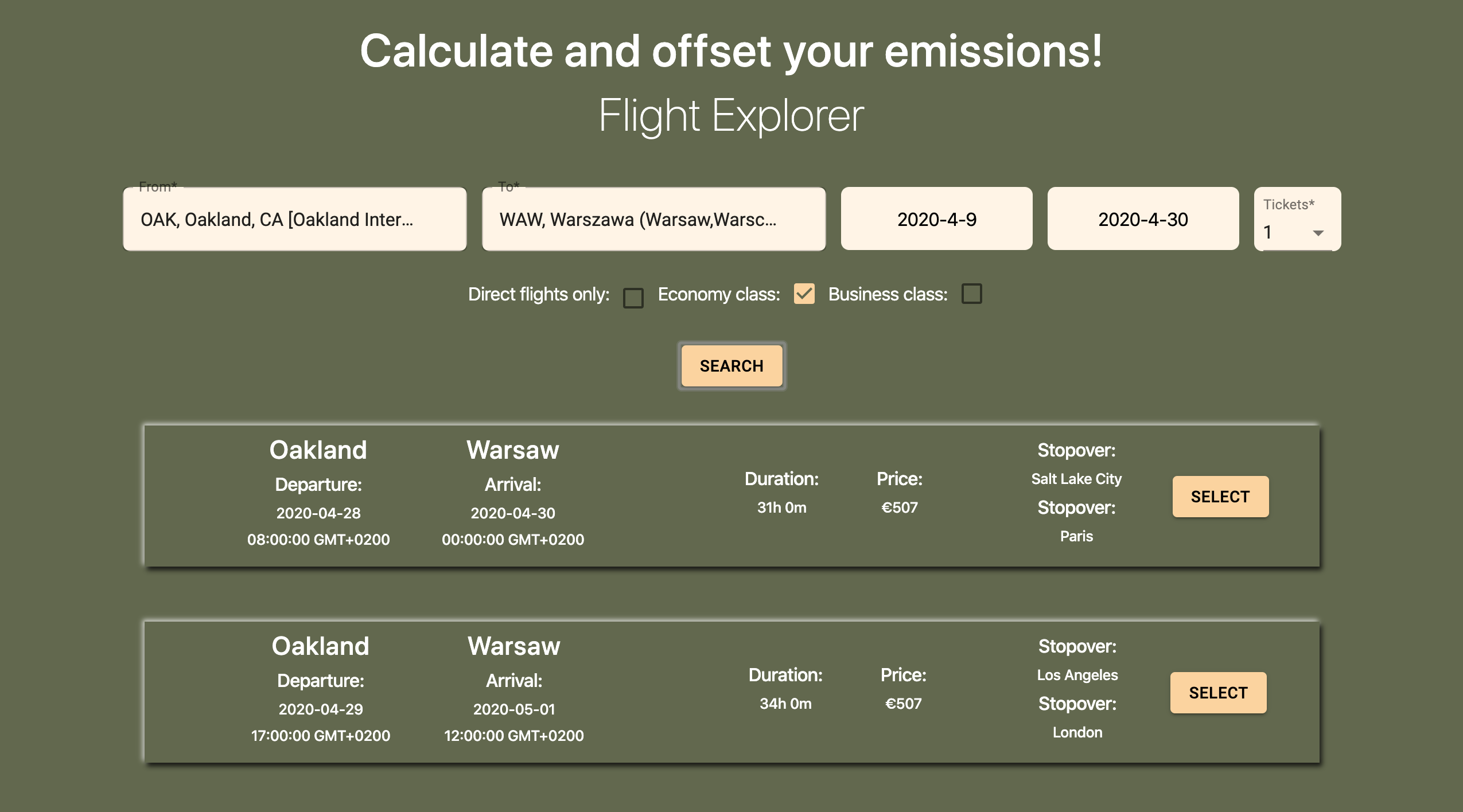 The application allows the user to search for flights (using Kiwi's API) and calculates the distance between the two airports and how much CO2 is emitted on a given flight.